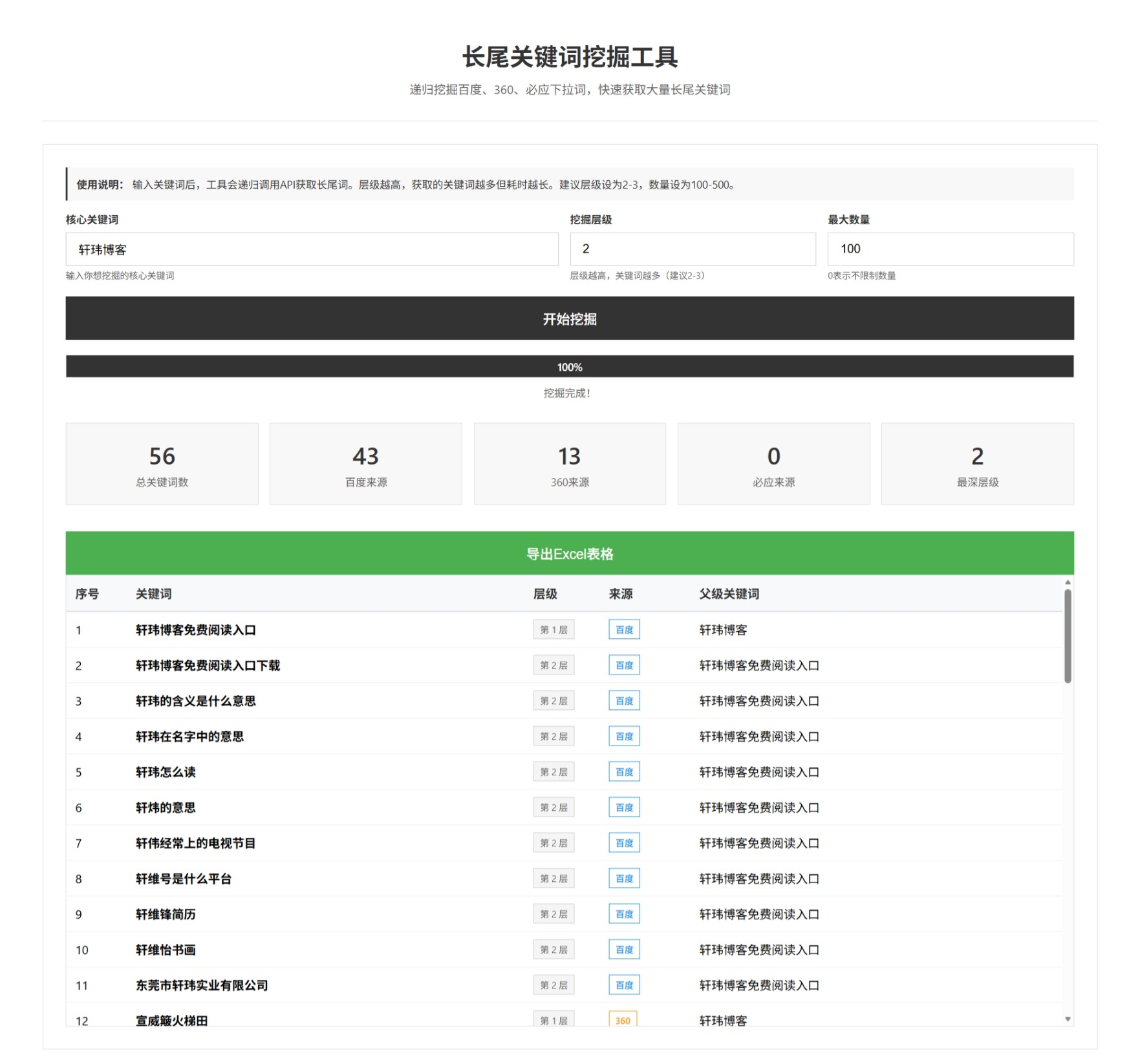 输入一个主词,层级深度,想要的数量,会同步请求百度必应360